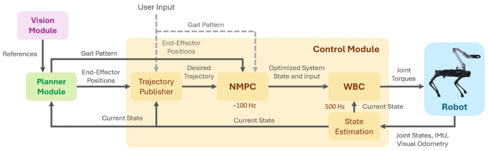 The state estimator consists of a Extended Kalman filter (EKF) which fuses the motor encoder readings, the visual odometry from the AlienGo front camera, and the IMU measurements to estimate the base pose and angular velocities, and the joint positions and velocities. This state estimation is fed into both the whole body planner and the controller. The WBC, along with the state estimator constitute the main control loop running at 500 Hz.