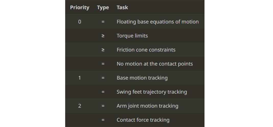where are the accelerations of the generalized coordinates. The computation of these decision variables is made through a series of calculations from and . The following table shows the WBC prioritized tasks list: